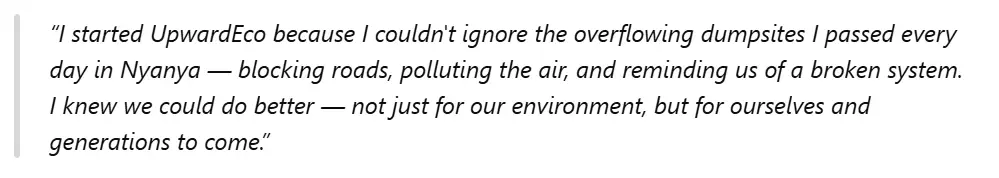 UpwardEco Ltd started with a vision to transform how we generally think about waste in our space. What began as discomfort has now become a nationwide movement for sustainability, innovation, and impact. At UpwardEco, we’re not just collecting waste, we’re building a culture of responsibility. Through advocacy, training, and smart technology, we are helping households and businesses make informed choices that protect the planet and unlock economic value. Our goal is bold but clear: reduce the amount of waste ending up in dumpsites by 95% by the year 2035. We are doing this by teaching and promoting source segregation, providing transparent waste evacuation services, and recovering valuable materials to fuel a circular economy. Whether you're a student, a business owner, a policymaker, or a household manager, you have a role to play. And we’re here to help you play it well. Welcome to the movement.